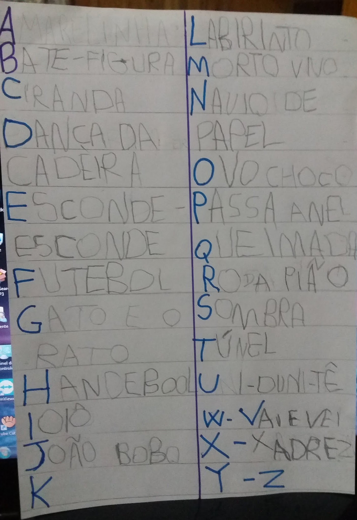 Ou seja, vão fazer uma lista com o alfabeto, escrevendo ao lado de cada letra algo divertido que começa com a mesma.